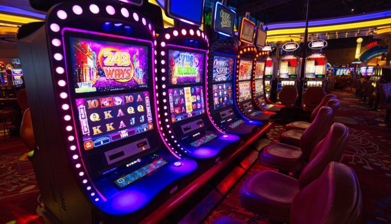 Slot Game yang menarik dengan mesin slot berwarna-warni di kasino yang ramai.